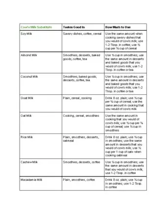 • Dairy-free milk is another excellent option for anyone who doesn't like the taste of cow's milk, follows a vegan diet, or simply wants something different. It even comes in different flavors like vanilla and chocolate. Coconut, soy, flax, cashew, almond, and several other milks are on the market as non-dairy milk alternatives.
