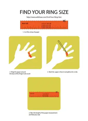 One quick and easy way to find your ring size is to measure your finger by wrapping a flexible measuring tape around it. If you don’t have a soft measuring tape, wrap a strip of paper around your finger and mark the spot where the paper overlaps itself. Measure the distance from the end of the paper to the mark. Compare your measurement to a ring sizing chart to figure out your ring size. Some jewelers might measure ring sizes in inches, while others use millimeters. For instance, if your finger measures 2.34 cm (59.5 mm), your ring size is 9. If you already have a ring that’s the right size, you can also find your size by comparing it to a printable ring sizing chart. To learn how to use a circular sizing chart, keep reading!