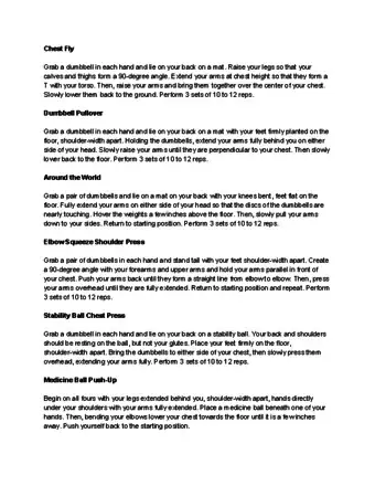 • Begin by lying flat on your back on an exercise bench and hold the weights with both hands. Keeping your back flat, push the weights away from your shoulders and into the air. Inhale as you bring the weights back down to your chest, and repeat the process 10 more times.[21]