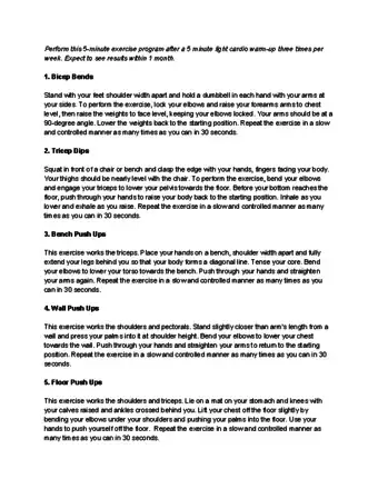 1Set up a routine. In order to get the most out of your work-outs and maximize muscle tone, it is important to set up a routine and stick to it. Choose 3 to 4 different exercises that you feel comfortable with and can perform correctly. You should also make sure to choose a selection of exercises that target different arm muscles, so as not to be working the same muscles all the time.