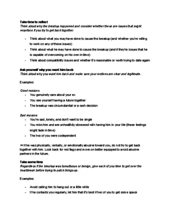 1Reflect on why the breakup happened. The first thing you need to do is take a long, hard look at what factors led up to the breakup. Consider whether these same difficulties are likely to cause more relationship problems if you try to get back together, or if you might be able to get past them.[1]