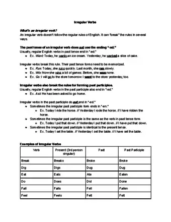 • An irregular verb doesn't follow this rule. For instance, "to begin" is an irregular verb. The past tense is "began," while the past participle is "begun." Irregular verbs don't follow any specific patterns.