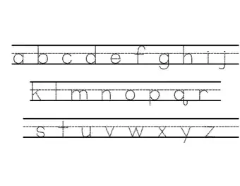 27Practice the letter z. A cursive z does not look like a printed z. Start with a slope from the bottom line to the middle line that forms a curve that is leaning to the right. At the end of the curve, make a curve that rises up and then slants downward, underneath the bottom line of the page. Make a loop underneath the bottom line and then finish with a curve upward towards the right of the page. This is z.