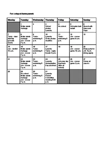 - For example, include entries such as, “Tuesday, 6:30 p.m. - Have dinner with Sam and Phil (finish up at work by 5:45!)” or “Saturday, 12:00 p.m. - Take Joey to the park.”