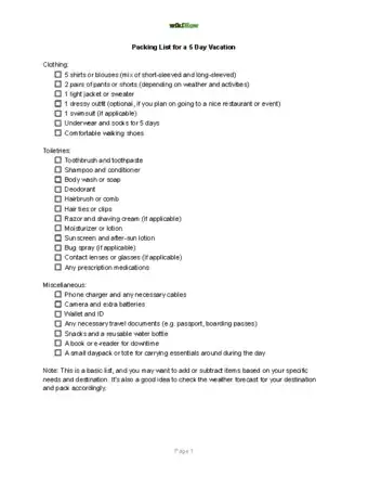Pack enough clothes to last you the week. For a 5 day vacation, you will want to bring 2-3 pairs of shorts or pants, 3-4 tops, a light jacket (or a heavy jacket, depending on where you are traveling), and 1 formal outfit if you are planning on attending a nice restaurant or event. If you are going to the beach, pack 2-3 swimsuits/trunks.[6]