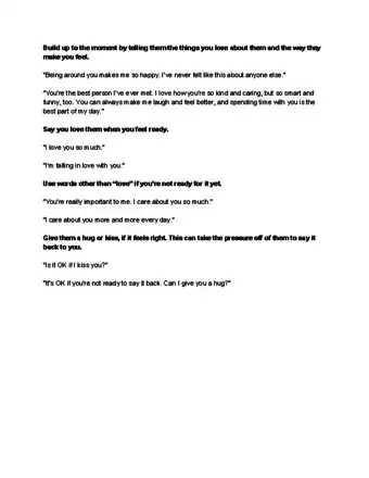 To say "I love you" to someone for the first time, wait until you're alone with them in person so the moment is intimate and special. For example, you could wait and tell your partner at the end of a date or when you're both cuddling on the couch. When the moment feels right and you have your partner's attention, share your feelings by saying something like "I love you" or "I'm in love with you." For more examples of ways that you can say "I love you" to someone, keep reading!