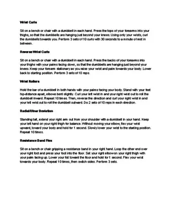 Try wrist curls as a good "bread and butter" exercise. Wrist curls are one of the quintessential wrist and forearm exercises. To do a wrist curl, you'll need a weighted dumbbell (you can also use a barbell to hit both hands at once).[3]