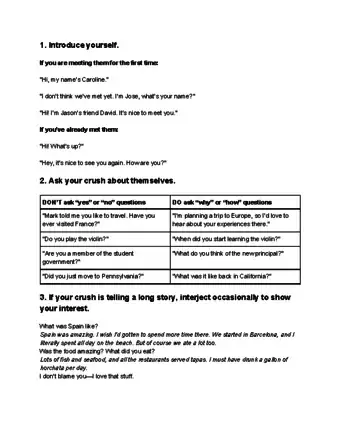 - Remember to try to avoid simple "yes" or "no" questions. If you ask your crush "Did you go to school in Canada?" they don't have to give you a long answer. If you ask your crush "What was it like going to school in Canada?" they'll talk a lot more.
