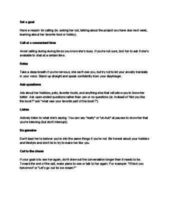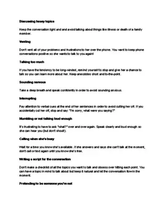Get to the point. While it’s good to make small talk with her about her interests and what’s going on in her life, you don’t want to let the conversation ramble on aimlessly. After the initial pleasantries, explain why you called. In most cases, she’ll appreciate your being direct.[9]