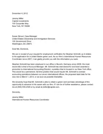 - For example, an acceptable paragraph may say: "This letter is to confirm the employment of employee. Employee has worked for ABC Corporation for seven years, starting on September 7, 2003. Employee holds the title of associate sales director, which is a permanent position here with ABC Corporation. Employee is still currently working as an associate sales director at ABC Corporation as of January 7, 2011."