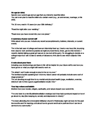 • You may want to choose an age that puts you in different circumstances than you are currently in. If you write the letter as a freshman in high school and read it when you’re in college, you’ll be able to see how much your life has changed and whether or not your goals have been met.