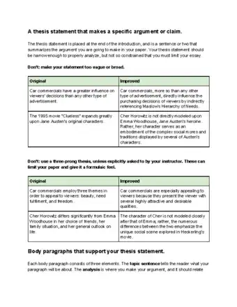 • Unless instructed to write one, avoid the "three-prong" thesis that presents three points to be discussed later. These thesis statements usually limit your analysis too much and give your argument a formulaic feel. It's okay to state generally what your argument will be.