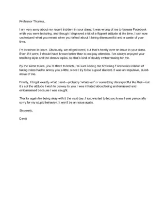 4Don't make excuses. It's tempting to minimize your blame or explain yourself with an excuse. Maybe there really is a great reason for why you acted the way you did, but bringing it up in your apology will only undermine your efforts because it shows the teacher that you don't feel totally at fault.[5]