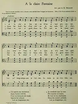 "À la claire fontaine" (French: [a la klɛʁ(ə) fɔ̃tɛn]; lit. 'By the clear fountain') is a traditional French song, which has also become very popular in Belgium and in Canada, particularly in Quebec and the Maritime provinces of New Brunswick, Nova Scotia, and Prince Edward Island.
