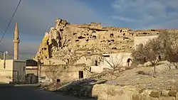 Çavuşin is a village in the Avanos District in Nevşehir Province in the Cappadocia region of Turkey.[1] Its population is 421 (2022).[2] It is on the road between Avanos and Göreme, about five kilometres north of Göreme. The older part of the village lies on and around a large ridge of rock visible for miles around. Most of the modern homes are closer to the main road where villagers were rehoused in the early 1960s amid fears that their old homes might collapse.[3] Until recently Çavuşin was more or less ignored by tourism despite its proximity to the Göreme honeypot. However, in the 2010s more hotels opened in Cavuşin too, especially in the older part of the village.