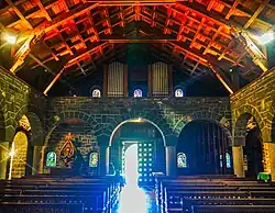 In collaboration with Édouard Malot, Novarina designed a church to be built out of local stone, called Taveyannaz sandstone; it is the same type of stone frequently used to build chalets in the Savoie. The roof is pointed and is meant to sustain large amounts of snow; the foundation of the structure is solidly anchored in the soil. The church is topped by a massive twenty-eight-metre bell tower, carefully designed to withstand local tectonic movements. Eight massive pillars support a hood to a depth of five metres. The interior of the building is meant to resemble a Roman chapel, with a rectangular nave flanked by two aisles. The choir is semicircular, surrounded by an ambulatory and sitting above the crypt. Arcades mounted on monolithic pillars separate different portions of the structure.