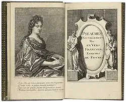 She exhibited regularly at the Salon, and at the same time produced poetry and translations. She was fluent in Hebrew, Greek, and Latin.[5] She published her book of Psalm paraphrases in 1694, as the Essay de pseaumes et cantiques mis en vers, et enrichis de figures. Her literary talent was recognized in 1699 when she was named a member of the Accademia dei Ricovrati, in Padua, under the academician name of Erato. Her Psalms were later set to music by Jean-Baptiste Drouard de Bousset and Antonia Bembo, a Venetian noblewoman.[5]