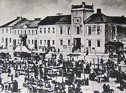 The Łomża Ghetto was a Nazi ghetto created by on 12 August 1941 in Łomża, Poland; for the purpose of persecution of Polish Jews. Two months after Operation Barbarossa, the invasion of the Soviet Union, the Jews were ordered to move there in a single day, resulting in panic at the main entry on Senatorska Street adjacent to the Old Market (Stary Rynek). The number of Jewish men, women, and children forced into the ghetto ranged from 10,000 to 18,000. The survivors of anti-Jewish pogroms, murders, and expulsions in Jedwabne, Stawiski, Wizna, and Rutki-Kossaki, as well as refugees from other locales, were interned in the ghetto.[1] Often, six families were housed there in a single room. The Ghetto was liquidated a year-and-a-half later on 1 November 1942, when all prisoners were transported aboard Holocaust trains to Auschwitz-Birkenau for extermination.[2][3]
