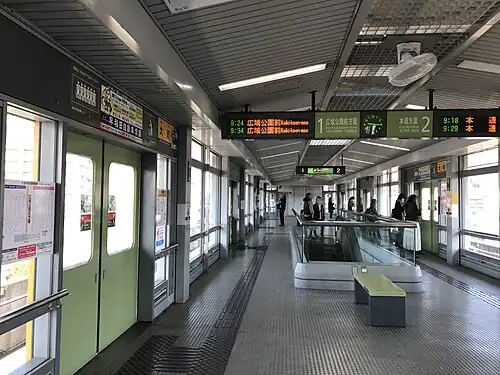 The Astram Line station building features one elevated island platform serving two tracks. A headshunt is located north-west of the station, and some trains in the morning use this to short turn at this station. The station has a color designation of yellowish-green.