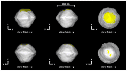2008 EV5 is an oblate spheroid (also described as "muffin-shaped"[17]) 400 m (1,300 ft) in diameter. It rotates very slowly in a retrograde direction. There is a 150 m (490 ft) diameter concave feature, possibly an impact crater, or a relic feature from a previous episode of rapid rotation that caused the asteroid's shape to reconfigure.[3]