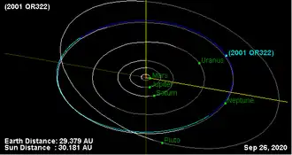 2001 QR322 orbits the Sun with a semi-major axis of 30.115 AU at a distance of 29.3–31.0 AU once every 165 years and 3 months (60,363 days). Its orbit has an eccentricity of 0.03 and an inclination of 1° with respect to the ecliptic.[3]