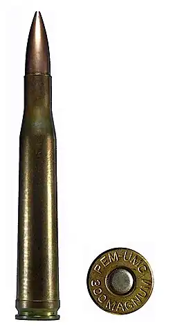 The cartridge offered superior ballistics to the .30-06 for long range, and the .300 H&H is almost as versatile with all bullet weights and types, especially if well-developed handloads are used. It excels with the heaviest .30-calibre bullets in the 180–220-grain range. SAAMI has set the pressure limit for this cartridge at 54,000 P.S.I.[3] Its case length calls for a full-length magnum action, and surplus military actions chambered for the .308 Norma Magnum or the .300 Winchester Magnum offered a lower cost alternative for similar ballistics in the 1960s.[4] The long .300 H&H case was designed for loading cordite, and those two modern magnum cartridges offered similar powder volume in a shorter case better adapted to ballistic uniformity with United States Improved Military Rifle (IMR) smokeless powder.[5]