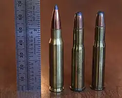 Round-nosed .303 Savage (center) with .308 Winchester (left) and .30-30 Winchester (right) | ||||||||