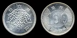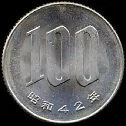 The 100 yen coin (百円硬貨, Hyaku-en kōka) is a denomination of Japanese yen. These coins were first minted in 1957 using a silver alloy, before the current design was adopted with an alloy change in 1967.[1] It is the second-highest denomination coin in Japan, after the 500 yen coin. The current 100 yen coin is one of two denominations that depict the emperor's rule date in Arabic numerals rather than kanji.