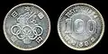 100 yen coinage was first authorized in 1951 with the specification that the coins be made of a silver alloy.[2] These were first minted for circulation in 1957 and feature a phoenix on the reverse. The alloy decided upon consisted of 60% silver, 30% copper, and 10% zinc and came at a time when banknotes of the same denomination were already in circulation.[3] The "100 yen" bill hence became a substitute to the coin as the two were allowed to co-circulate.[4] The design of the coin was later changed in 1959 which removed Latin script ("Yen") and changed the reverse side to show a sheaf of rice. To commemorate the summer 1964 Olympics in Tokyo 16 million ounces of silver was used to strike the 80,000,000 coins produced. None of these coins were recorded as ever going into circulation as they were grabbed and stored away as collectors items.[4] Minting 100 yen coins was profitable up into the mid-1960s until the worldwide price for silver bullion began to rise. The Japanese government had planned on producing 800 million silver coins over a 10-year span,[a] but the amount of silver held was insufficient.[5] Silver was dropped from the coinage in 1967, which led to coin hoarding and silver smuggling outside of the country for melting.[6]