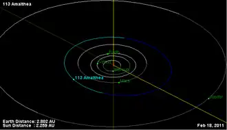 1. ^ Yeomans, Donald K., "113 Amalthea", JPL Small-Body Database Browser, NASA Jet Propulsion Laboratory, retrieved 12 May 2016.