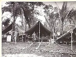 During World War II, like most Militia units, the 11th Battalion performed garrison duties for most of the war. It was mobilised for war service at Melville, Western Australia, in December 1941.[65] In the early part of the war, the battalion remained in Western Australia, and was assigned to the 4th Division, as part of the 13th Brigade, before later moving to the Northern Territory in 1943,[70] where the 13th Brigade was deployed to defend Darwin, replacing the 3rd Brigade.[71] Later in 1943, the battalion was gazetted as an AIF battalion, after more than 65 percent of its personnel volunteered to serve outside Australian territory.[64] As the threat to Darwin passed, its garrison was reduced and the 13th Brigade was reorganised to prepare it for operations in the Pacific. The battalion, along with the rest of the 13th Brigade, was later transferred to the 5th Division and saw service against the Japanese during 1945 in the New Britain Campaign. Due to the large size of Japanese forces on New Britain, the Australian campaign was focused mainly upon containment.[72] After landing at Jacquinot Bay the battalion was based around the Tol Plantation and conducted patrolling operations to restrict the Japanese to the Gazelle Peninsula. Little contact was made and actual combat was limited; the battalion's casualties amounted to three dead and four wounded.[70] Following the end of the war, the 11th Battalion occupied Rabaul,[71] before being disbanded on 11 April 1946.[64]