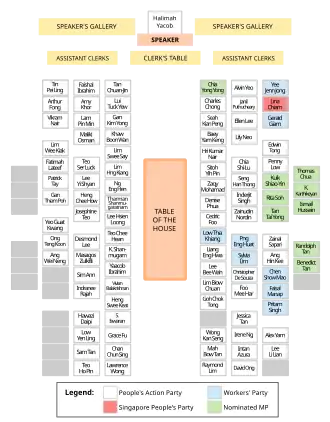 The 12th Parliament of Singapore was a meeting of the Parliament of Singapore. The first session commenced on 10 October 2011 and was prorogued on 25 August 2015.[2][3] The membership was set by the 2011 Singapore General Election on 7 May 2011 and changed three times due to expulsion of Hougang Single Member Constituency MP in 2012 and resignation of Punggol East Single Member Constituency MP and Speaker of Parliament over extra-marital affairs in 2013, as well as the death of Lee Kuan Yew, former Prime Minister of Singapore and MP of Tanjong Pagar Group Representation Constituency.