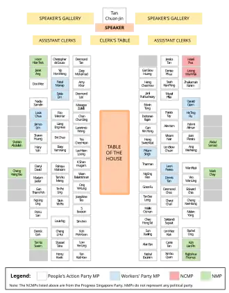 - ^ 93 MPs were elected in the 2020 Singaporean general election. There are six vacant seats at dissolution.