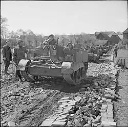 The 159th Brigade landed in Normandy, as part of Operation Overlord (codename for the Battle of Normandy), on Juno Beach on 13 June 1944,[7] seven days after the initial D-Day landings on 6 June 1944. During the Battle for Caen the brigade took part in Operations Epsom, Goodwood, Bluecoat and the actions around the Falaise Pocket.[8] In August the brigade, commanded now by Brigadier John B. Churcher, together with the rest of the 11th Armoured, advanced into France, participating in the "swan" to Amiens; the fastest and deepest penetration into enemy territory ever made until the Gulf War in the early 1990s. The 11th Armoured Division then turned northward to Belgium and captured the city of Antwerp on 4 September.[9]