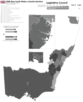 The 1848 New South Wales colonial election was held between 29 July and 2 August 1848. This election was for 24 seats in the New South Wales Legislative Council and it was conducted in 15 single-member constituencies, two 2-member constituencies and one 5-member constituency, all with a first past the post system. The Legislative Council was a hybrid system with 36 members, 24 elected, 6 appointed by virtue of their office (Colonial Secretary, Colonial Treasurer, Auditor-General, Attorney General, Commander of the forces and Collector of Customs)[1] and 6 nominated. The appointments and elections were for five year terms.[2][3][4][5]