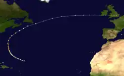 On October 22, the schooners Etna and Mahaska encountered this storm offshore South Carolina,[9]: 46  leading to the track beginning on that date just north of the Abaco Islands in the Bahamas. The storm initially moved to the north, before curving northeastward by the following day. Only slight intensification likely occurred, with the system peaking with winds of 60 mph (95 km/h) early on October 24. Several hours later, however, the storm transitioned into an extratropical cyclone about halfway between Bermuda and Nova Scotia. Before dissipating northwest of Ireland on October 28, the extratropical remnants reached hurricane-equivalent intensity over the northern Atlantic,[6] based on the ship Rhaetia recording sustained winds of 81 mph (130 km/h) and a minimum barometric pressure of 983 mbar (29.0 inHg).[9]: 46–47