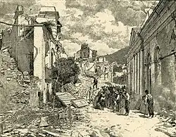The 1883 Casamicciola earthquake, also known as the Ischia earthquake occurred on 28 July at 20:25 local time (Central European Time) on the island of Ischia in the Gulf of Naples in Italy. Although the earthquake had an estimated moment magnitude (Mw) of 4.2–5.5, considered moderate in size,[3] it caused intense ground shaking that was assigned XI (Extreme) on the Modified Mercalli intensity scale. Between 2,313 and 3,100 people lost their lives. The city also suffered great property losses, with 80 percent of all homes destroyed.[4] This earthquake was exceptionally destructive for its magnitude mainly due to its shallow focal depth.