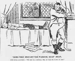 Cartoon by Staniforth satirising England's large defeat to Wales. The score is given in the style "goals.tries.minors;" John Bull quotes Tennyson's "Home They Brought Her Warrior Dead."