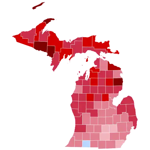 As McKinley's running mate, Theodore Roosevelt did not campaign in the state, as it was viewed as safe for the Republicans. All forecasts had the state being carried by McKinley,[10] and in some the state was regarded as so safe as not to be discussed. These predictions were borne out by the election result when McKinley carried Michigan by 58.05 percent to Bryan's 38.96 percent and all but one county – St. Joseph in Michiana, which would prove the last time until Woodrow Wilson in 1916 when a Democrat won any Michigan county in a two-way race, for the state would become apart from Vermont the most solidly one-party Republican in the nation for the first third of the 20th century.