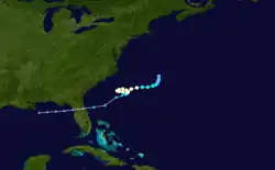 In late September, a cold front moved into the Gulf of Mexico. By October 3, a low pressure associated with the front developed.[4] Initially extratropical, the low moved east-northeastward and crossed Florida on October 4. After entering the Atlantic early on October 5, the low began strengthening and soon reached the equivalency in intensity to a tropical storm. Around 00:00 UTC on October 6, the system transitioned into a tropical cyclone while situated about 260 mi (420 km) southeast of Cape Fear in North Carolina. Already a strong tropical storm, the cyclone intensified into a hurricane about six hours later. [5] Late on October 6, a vessel observed a barometric pressure of 996 mbar (29.4 inHg), the lowest in relation to the stop. Based on this, it is estimated that the hurricane peaked with maximum sustained winds of 90 mph (150 km/h).[4] The storm then began to execute a small cyclonic loop, which continued until early on October 8. By then, the cyclone was moving eastward and weakened to a tropical storm around 00:00 UTC on October 9. About 24 hours later, the system weakened to a tropical depression. At 18:00 UTC on October 10, the depression dissipated about 280 mi (450 km) northeast of Bermuda.[5]