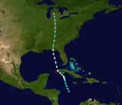 A tropical depression developed over the western Caribbean about 240 mi (385 km) south-southwest of Negril, Jamaica, on August 31. The depression moved north-northwestward and quickly intensified into a tropical storm later that day. Early on September 2, the storm strengthened into a hurricane. Several hours later, the cyclone intensified into a Category 2 hurricane and peaked with maximum sustained winds of 100 mph (155 km/h). A brief jog to the northwest caused the storm to strike Isla de la Juventud and Pinar del Río Province, Cuba, at the same intensity early on September 3. The storm resumed its north-northwestward course and weakened to a Category 1 hurricane before emerging into the Gulf of Mexico. Around 11:00 UTC on September 4, the hurricane made landfall near Apalachicola, Florida, with winds of 90 mph (150 km/h). A barometric pressure of 982 mbar (29.0 inHg) was observed, the lowest known pressure in relation to the storm. The cyclone weakened to a tropical storm as it crossed southeastern Alabama later that day and deteriorated to tropical depression intensity over Tennessee early on September 5. The system persisted until dissipating over central Michigan late the next day.[3]