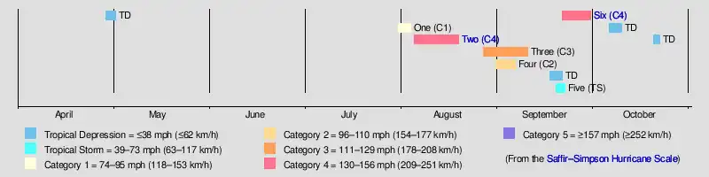 The season's activity was reflected with an accumulated cyclone energy (ACE) rating of 130, the highest total since 1906 and far above the 1911–1920 average of 58.7.[1][6] ACE is a metric used to express the energy used by a tropical cyclone during its lifetime. Therefore, a storm with a longer duration will have high values of ACE. It is only calculated at six-hour increments in which specific tropical and subtropical systems are either at or above sustained wind speeds of 39 mph (63 km/h), which is the threshold for tropical storm intensity. Thus, tropical depressions are not included here.[1]