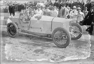 A big field of 30 cars was entered for the Grand Prize.[9] A number of American manufacturers were now producing racing cars and running works teams. Stutz had signed Howdy Wilcox, Earl Cooper and Norwegian-American Gil Andersen. Billy Carlson and Eddie Rickenbacker ran Maxwells for the United States Motor Company team, while Barney Oldfield ran one for the Maxwell company. The Duesenberg brothers had former riding mechanics Eddie O'Donnell (for Rickenbacker) and Tom Alley (for DePalma); Case ran with Harry Grant and Eddie Hearne.[10] At the end of the abbreviated 1914 season, a few of the leading European cars had been purchased and shipped across to the United States. Ralph DePalma had upgraded his older Mercedes with the 18/100 car that Louis Wagner[11] (or Lautenschlager[6]) had raced at the French Grand Prix. Peugeot Auto Import entered a 7.6-litre EX-3 for Dario Resta (which had been raced by Georges Boillot at the previous year’s Indianapolis race), which had been overhauled by Harry Miller. Just prepared in time, it was still in its primer-white colour.[12] Claude Newhouse was running a Delage Type Y.