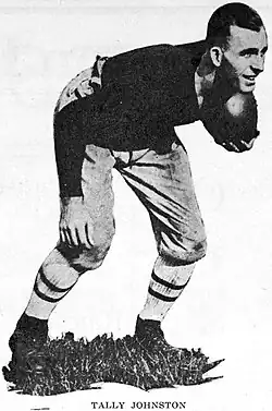 Joe Guyon, the team's best passer,[20] was a Chippewa Indian who was born on the White Earth Indian Reservation; his brother, Charles "Wahoo" Guyon, was the assistant coach.[21] Guyon had played for Pop Warner at Carlisle, and had to sit out the 1916 season in accordance with conference transfer rules.[22][23] He ran through (and over) opponents, in contrast to Strupper's dodging style.[22] Judy Harlan said about Guyon, "Once in a while the Indian would come out in Joe, such as the nights Heisman gave us a white football and had us working out under the lights. That's when Guyon would give out the blood curdling war whoops."[21]