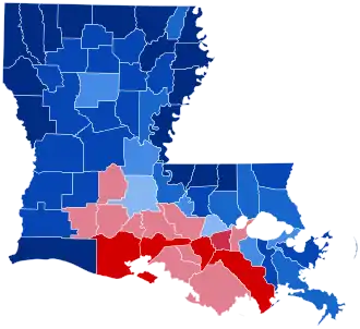 In Acadiana, the 1920 election would see a temporary break with “Solid South” voting patterns, as anger at the Wilson Administration's foreign and domestic policies caused the region's voters – much more moderate on racial issues than the rest of Louisiana[11] – to break powerfully from Democratic nominee James M. Cox.[12] Harding carried fourteen of the Acadian parishes, and in the two most sugar-dependent, Assumption and Lafourche, he received over three-quarters of the vote. In the remainder of Louisiana, as racially hardline as anywhere in the South, Democratic voting remained as rock-solid as ever despite nominee James M. Cox suffering a record 26.17 point landslide defeat and carrying only 41 counties outside antebellum slave states and Oklahoma. The revolt in Acadiana, however, was sufficient to drop Louisiana to Cox’ fourth-best state behind Georgia as well as South Carolina and Mississippi (as was typical in the “Solid South” era). As of the 2024 election, this is the last time that a Republican has won a majority in Iberville Parish, as Dwight D. Eisenhower, Richard Nixon, and Donald Trump only received pluralities.
