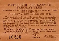 The athletic department sold 1927 football season ticket booklets to alumni, bondholders, faculty members and student family members for the first time.[28][29] Children under 16 could join the Pittsburgh Post-Gazette Fair Play Club and get a 25 cent ticket that was good for a ride on the trolley to the game, entrance to the game and then a ride home on the trolley after the game.(see photo)
