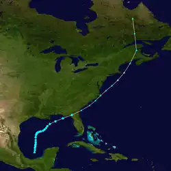 A tropical disturbance was first identified southeast of Puerto Rico on August 24.[2] Moving northwestward, the disturbance developed into a tropical depression two days later north of Hispaniola. Slowly moving towards the west-northwest, it intensified into a tropical storm late on August 27. The storm made landfall on the north end of Key Largo, Florida, with sustained winds of 65 mph (105 km/h) around 04:00 UTC on August 30, before striking the mainland south of Homestead. After crossing the Florida peninsula and entering the Gulf of Mexico, the system reached its peak intensity as a Category 1 hurricane with maximum sustained winds of 85 mph (137 km/h), before subsequently making its final landfall just east MississippiAlabama state line on September 1 at the same intensity. Over land, the hurricane weakened, and after becoming an extratropical cyclone over northwestern Mississippi on September 2,[3] the storm merged with another extratropical system over Quebec on September 4.[2]
