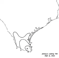 - ^ a b c d e R. Hanson Weightman (September 1933). "Tropical Disturbances of August 1933" (PDF). Monthly Weather Review. 61 (8). American Meteorological Society: 234–235. Bibcode:1933MWRv...61..362D. doi:10.1175/1520-0493(1933)61<362:TSO>2.0.CO;2. Retrieved June 9, 2012.