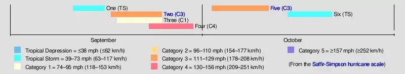 The 1941 Atlantic hurricane season was the period in 1941 in which tropical cyclones formed in the Atlantic Basin. It was a relatively inactive hurricane season, with only six known storms. It officially began on June 16, 1941, and lasted until November 1, 1941.[1] These dates delimit the period of each year when most tropical cyclones tend to form in the Atlantic basin. Of the six cyclones, four attained hurricane status, and three became major hurricanes. The active season had an abnormally late start; the first system formed on September 11, nearly three months after the official beginning date. The season was also short-lived, as all sixstorms developed in rapid succession. On September 23, three hurricanes existed simultaneously in the Atlantic basin.