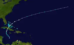 The most powerful cyclone of the season was first noted as an intensifying hurricane east of the Leeward Islands early on September 12. It moved steadily west-northwest, passing north of Puerto Rico as a Category 2 hurricane and moving through the Turks and Caicos Islands at Category 3 intensity. The mature storm attained its peak as a Category 4 hurricane with winds of 130 mph (210 km/h) after crossing Andros, Bahamas and soon began a gradual west-northwest turn. It moved ashore the northern end of Key Largo at 19:30 UTC on September 15, progressing into mainland Florida near Homestead, and whereupon the cyclone became the third strongest hurricane to hit Miami-Dade County, Florida on record.[18] The system then curved north throughout the central portions of the state before emerging offshore and making a second landfall near Savannah, Georgia, with winds of 70 mph (110 km/h). A continued northward track brought the cyclone into the South Atlantic States, where it completed extratropical transition roughly 50 mi (80 km) east-northeast of Danville, Virginia. The post-tropical cyclone fluctuated in strength and was last noted east of Newfoundland on September 20.[2]